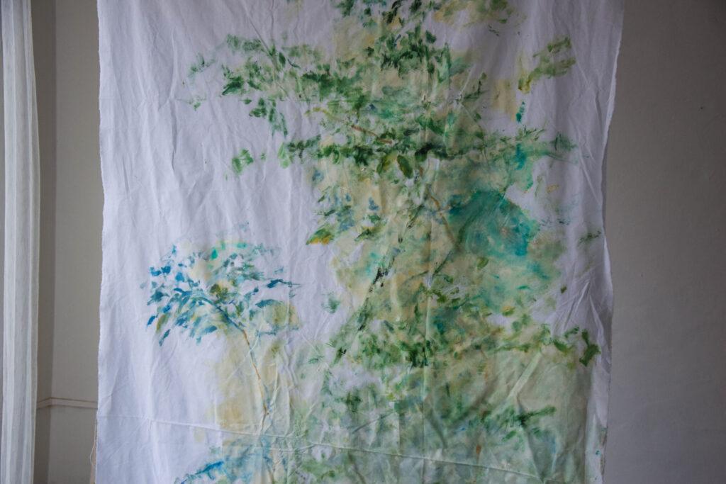 Le pennellate su tela naturale e tessuti intrecciano storie di resilienza e armonia. L’uso di materiali semplici e autentici, carichi di memorie ancestrali, crea un dialogo tra la vitalità della foresta e la trama della vita umana. Ogni opera diventa così un racconto stratificato, dove natura e cultura si incontrano per celebrare ciò che è fragile ma essenziale.