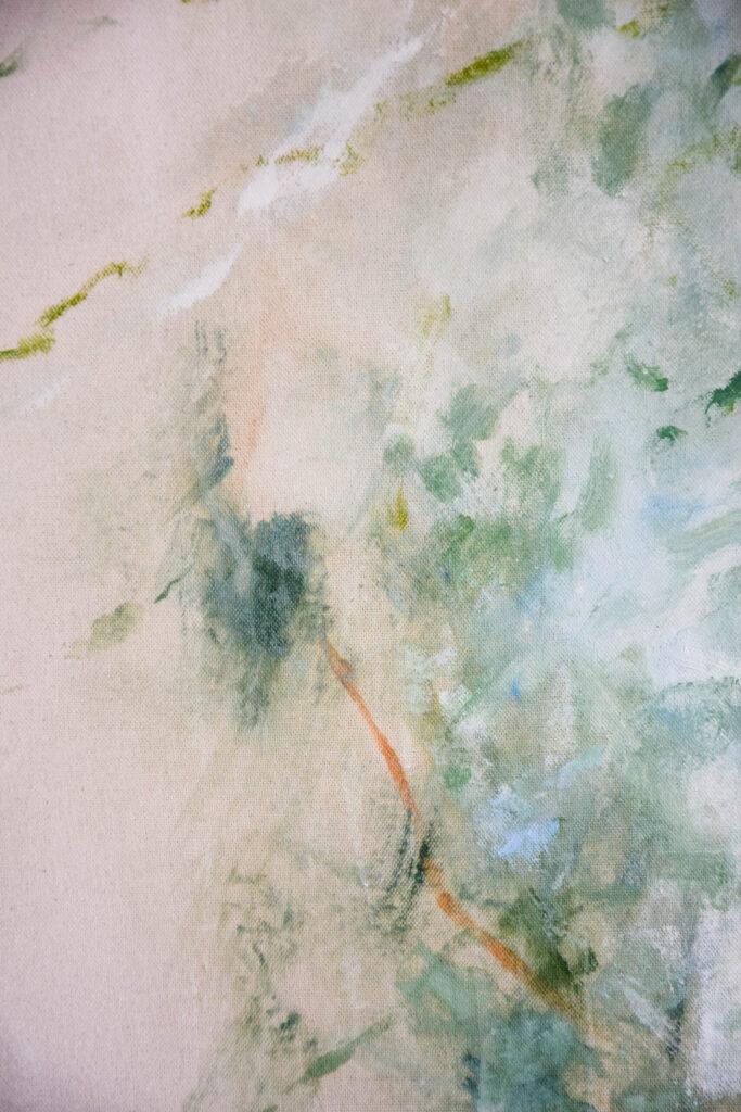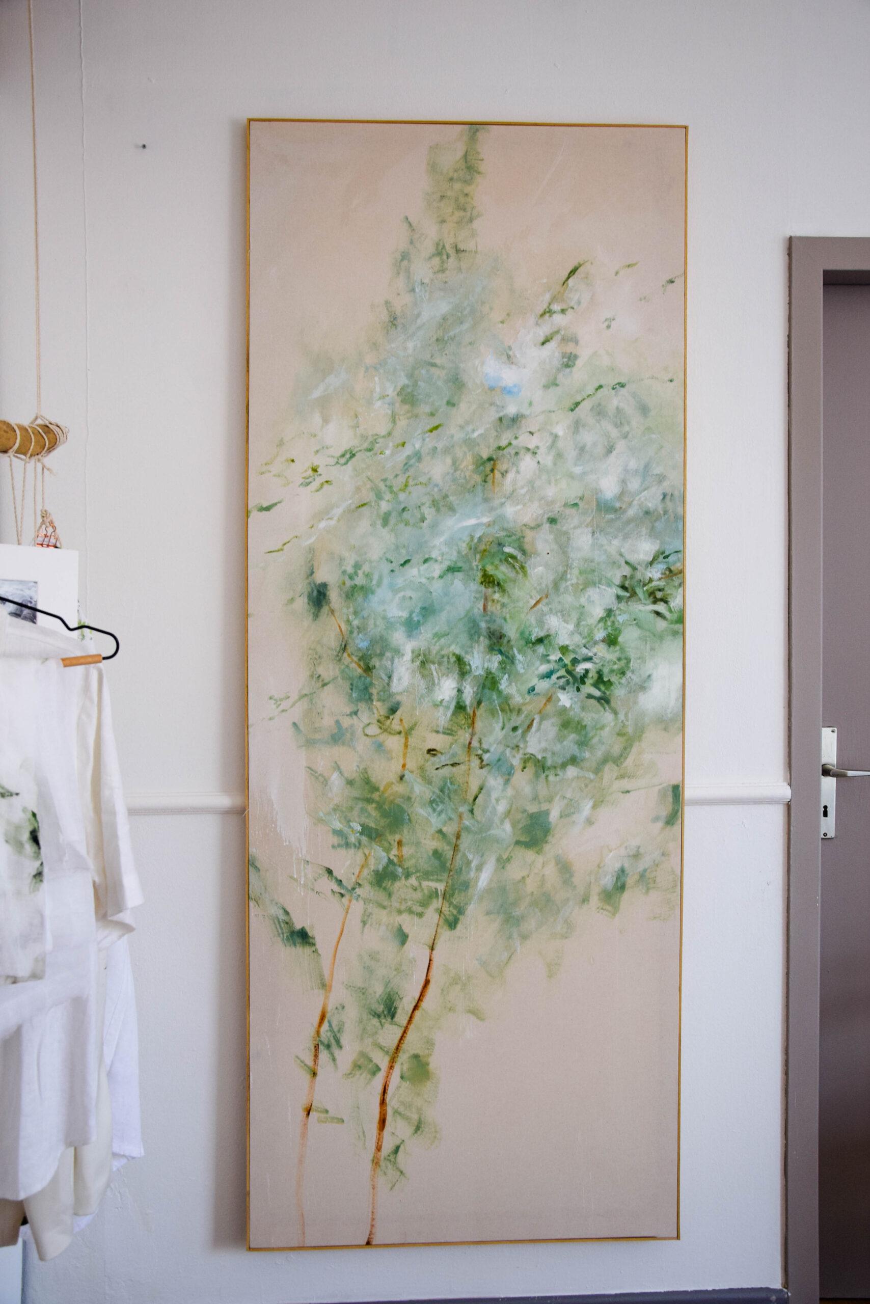Le pennellate fondono astrazione e realismo, creando spazi evocativi. I verdi intensi, i marroni profondi e le ombre blu disegnano una natura viva e pulsante. Le tele che utilizzo non sono solo superfici per dipingere, ma portano con sé una storia intima e culturale.