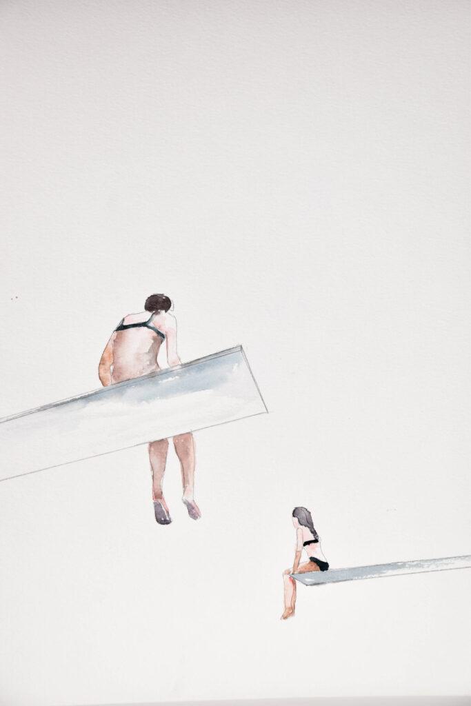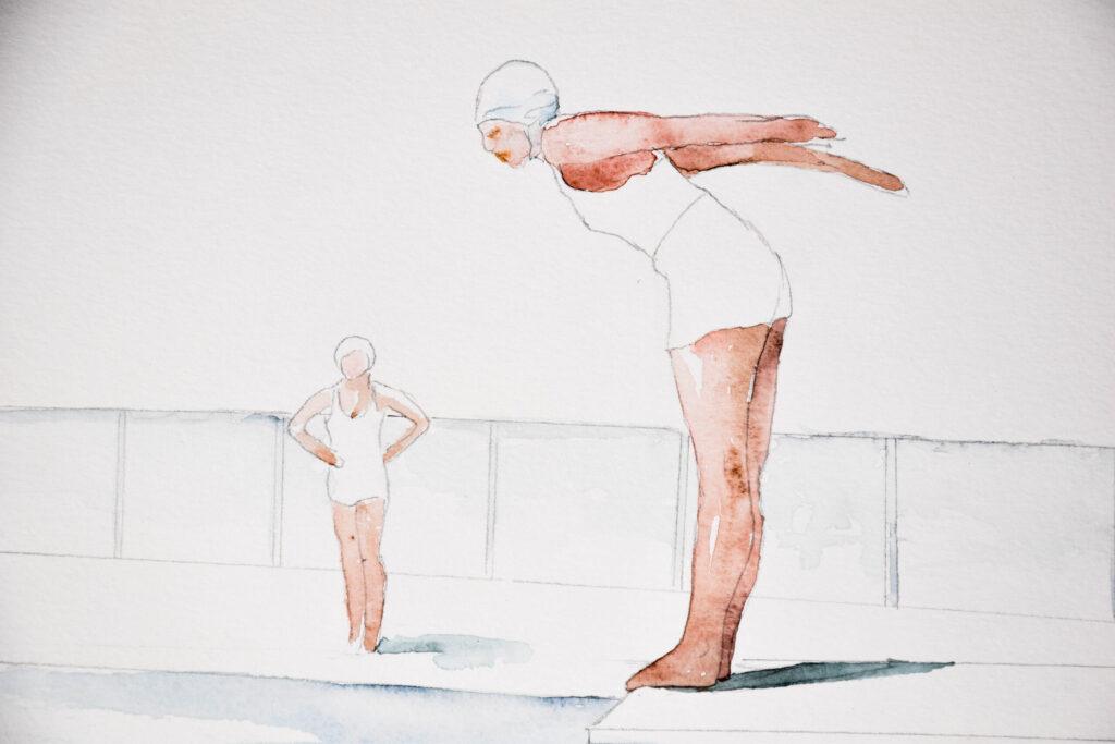 Le tuffatrici, soggetto principale delle mie tele, sono molto più di semplici atlete. Esse rappresentano l’audacia di affrontare l’ignoto e la grazia di coloro che sono all’altezza della sfida. In un mondo dove l’arte contemporanea si intreccia spesso con la performance atletica, le mie opere offrono una visione unica di questo dinamismo. Queste figure, immortalate sulle soglie del tuffo, simboleggiano la pausa riflessiva prima dell’azione, un momento sospeso che risuona profondamente con la condizione umana.